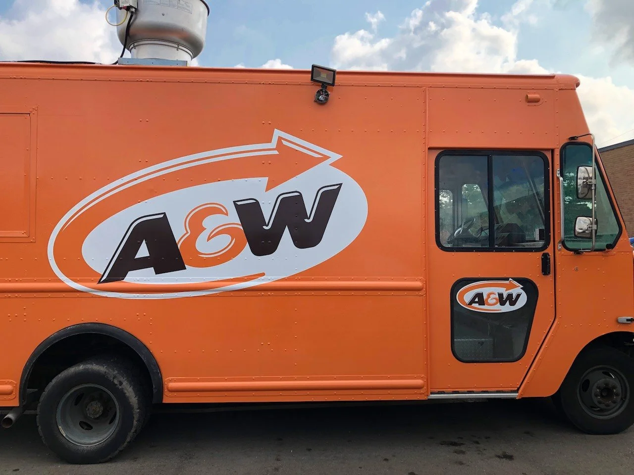 The photo shows bright custom vehicle graphics for a food truck special event. The bold colors and easy-to-read text, clearly displaying the brand name and tagline to draw in a crowd. Entire truck was wrapped in 3M vinyl graphics.